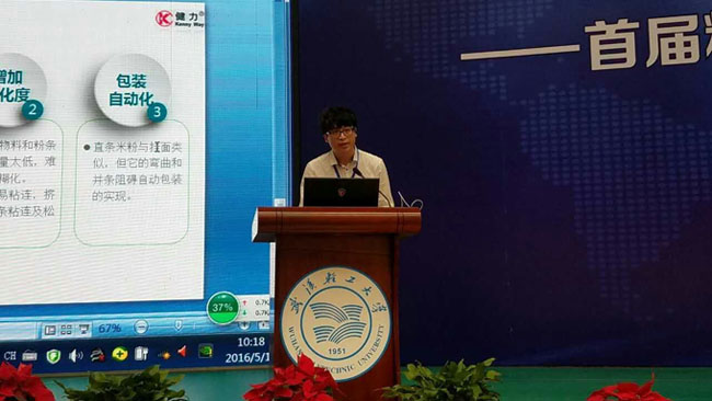 5月17~18日,在武汉轻工大学举行的由国家粮食局、中国科协主办的2016年全国粮食科技活动周上,我司研发的全自动直条米粉生产线被列为全国首届粮食科技成果转化对接推介重点项目。公司总经理助理王起在推介活动会上作了发言。