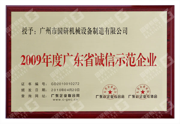 此次被评为“2009年度广东省诚信示范企业”,是对国研机械的一次巨大鼓舞和鞭策。国研机械将再接再厉,以“诚信经营”作为企业生存之本,忠实履行企业经济责任与社会责任,做用户最信赖的企业,为社会提供最优质的产品与服务。