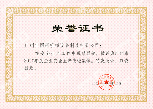 近日,在广州市人民政府召开的安全生产工作总结暨表彰大会上再次传来喜讯,广州市国研机械设备制造有限公司被广州市人民政府授予“广州市2010年度企业安全生产先进集体”荣誉称号。这是我司获得中华全国总工会和国家安全生产监督管理总局授予2009年度全国“安康杯”竞赛优胜企业称号后,被授予的又一殊荣。